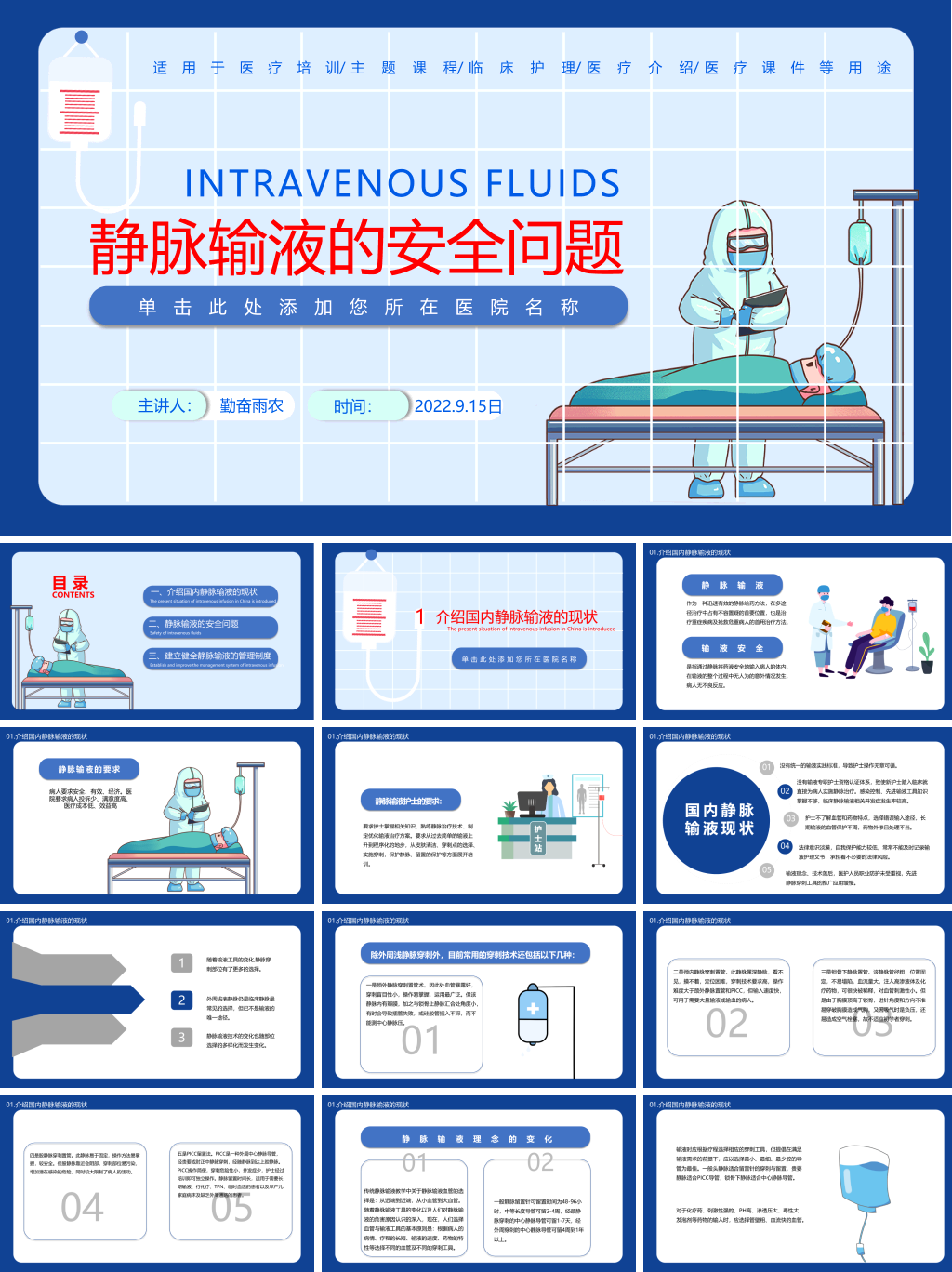 本套静脉输液安全PPT模板,模板编号:P83128,大小10MB,共27页,比例为16:9,由封面、目录、转场页、内容、结尾5个部分构成。