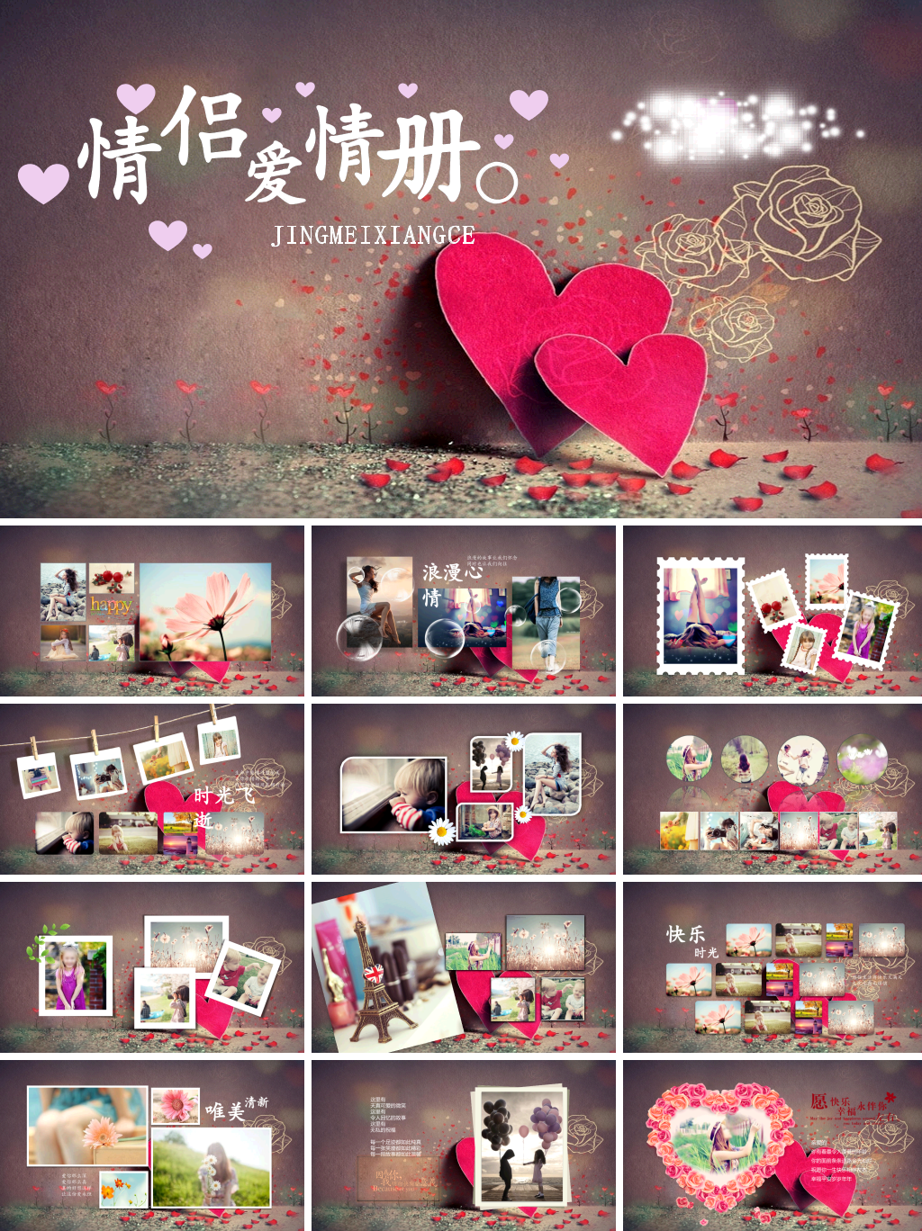 本套情侣相册PPT模板,模板编号:P29549,大小10MB,共27页,比例为16:9,由封面、目录、转场页、内容、结尾5个部分构成。