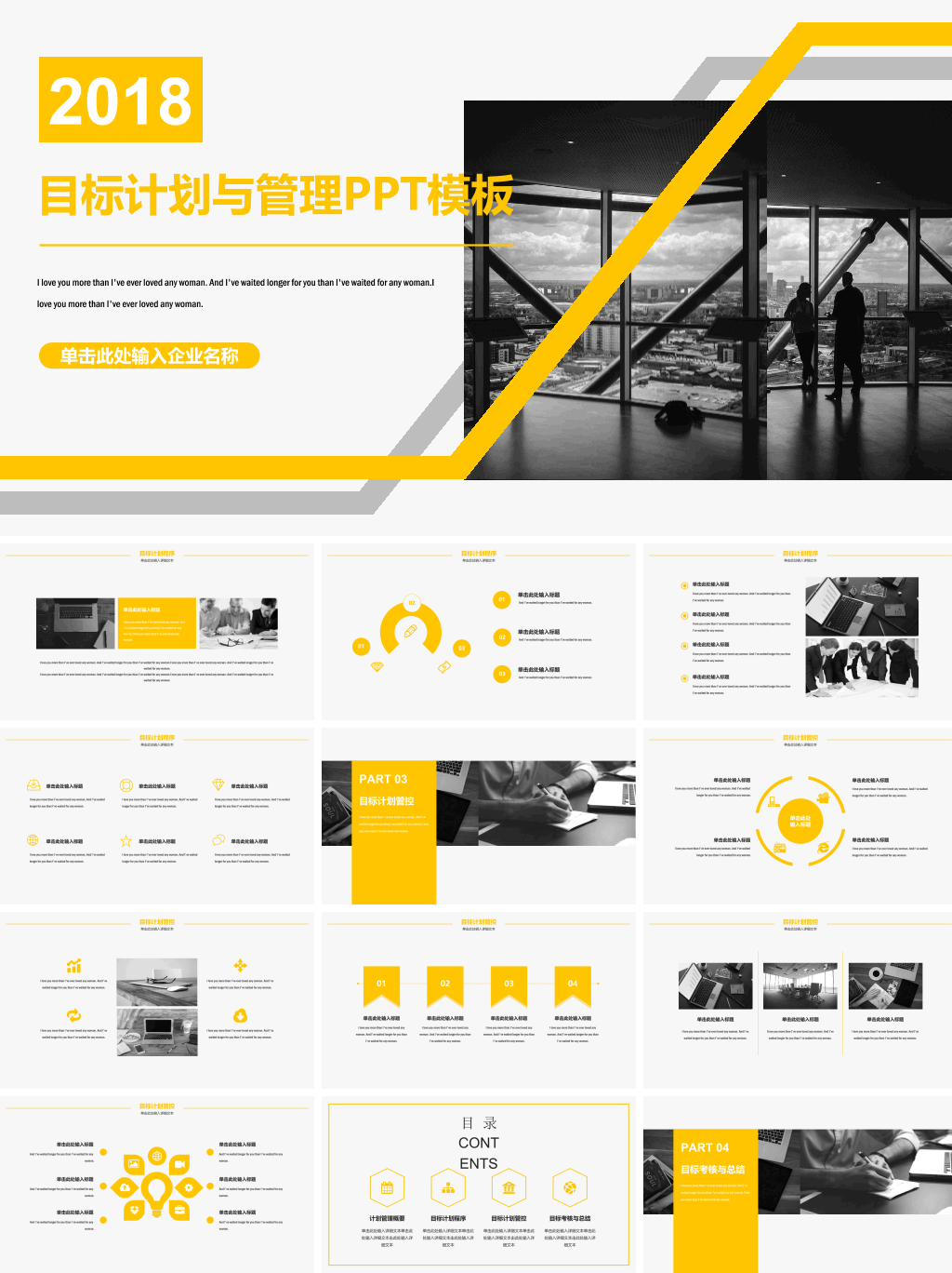 本套黄色商务高端大气目标计划与管理PPT模板,模板编号:P64439,大小10MB,共27页,比例为16:9,由封面、目录、转场页、内容、结尾5个部分构成。