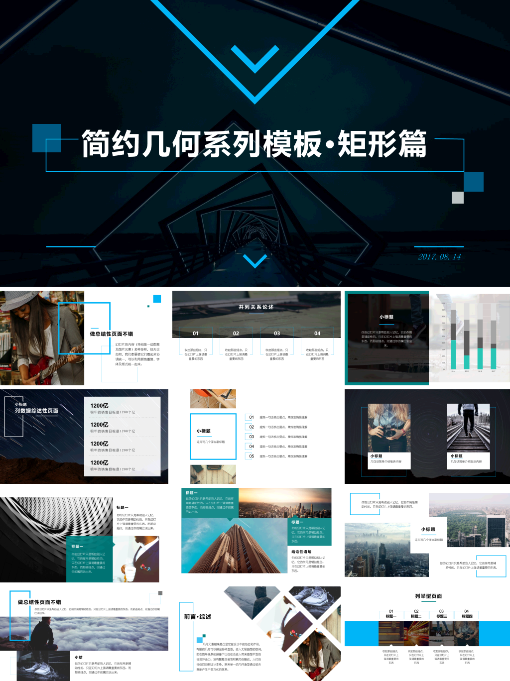 本套简约几何系列PPT模板,模板编号:P54162,大小10MB,共27页,比例为16:9,由封面、目录、转场页、内容、结尾5个部分构成。
