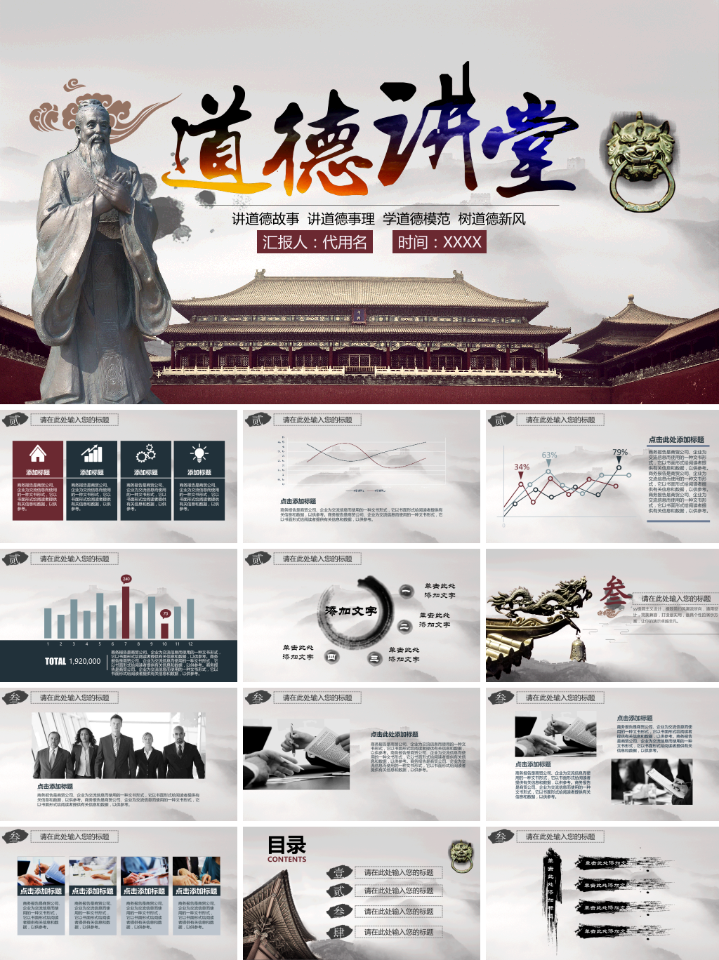内含橙色,灰色,红色多种配色,精美中国风风格设计,动态播放效果,精美实用。