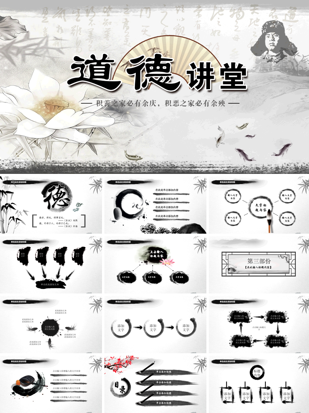 这是一款融合了道德文化和水墨风格的PPT模板,设计精美且具有中国特色。模板包含27页,16:9比例,拥有黑色和灰色等多种配色方案,并带有动态播放效果。适用于各类文化、教育报告,内容可编辑,适合用Office或WPS软件进行修改。