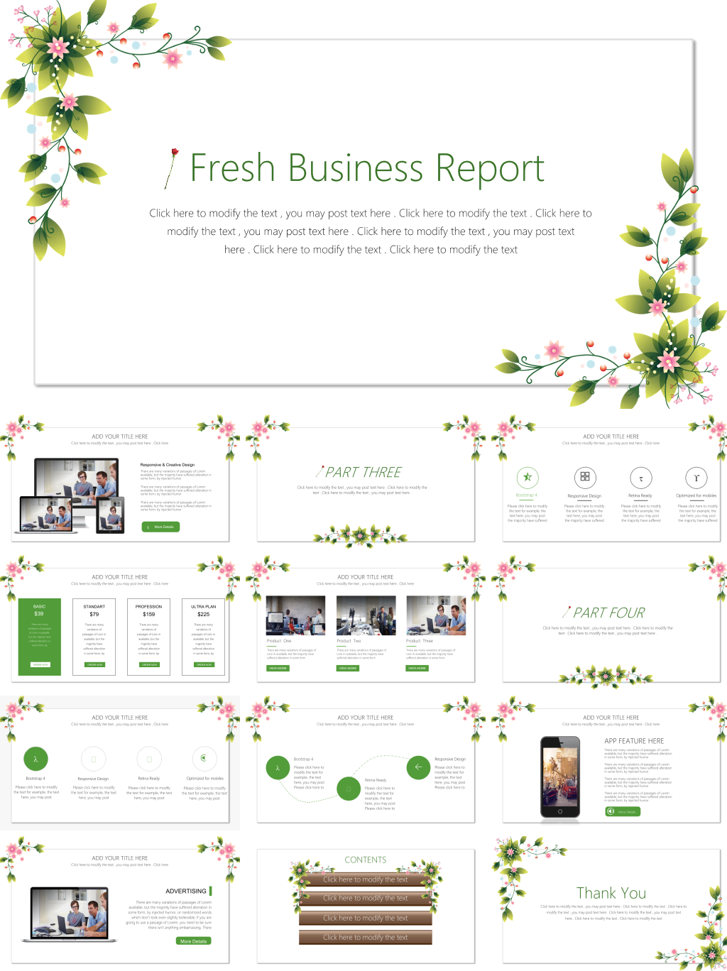 本套小清新业务汇报PPT模板,模板编号:P99682,大小10MB,共27页,比例为16:9,由封面、目录、转场页、内容、结尾5个部分构成。