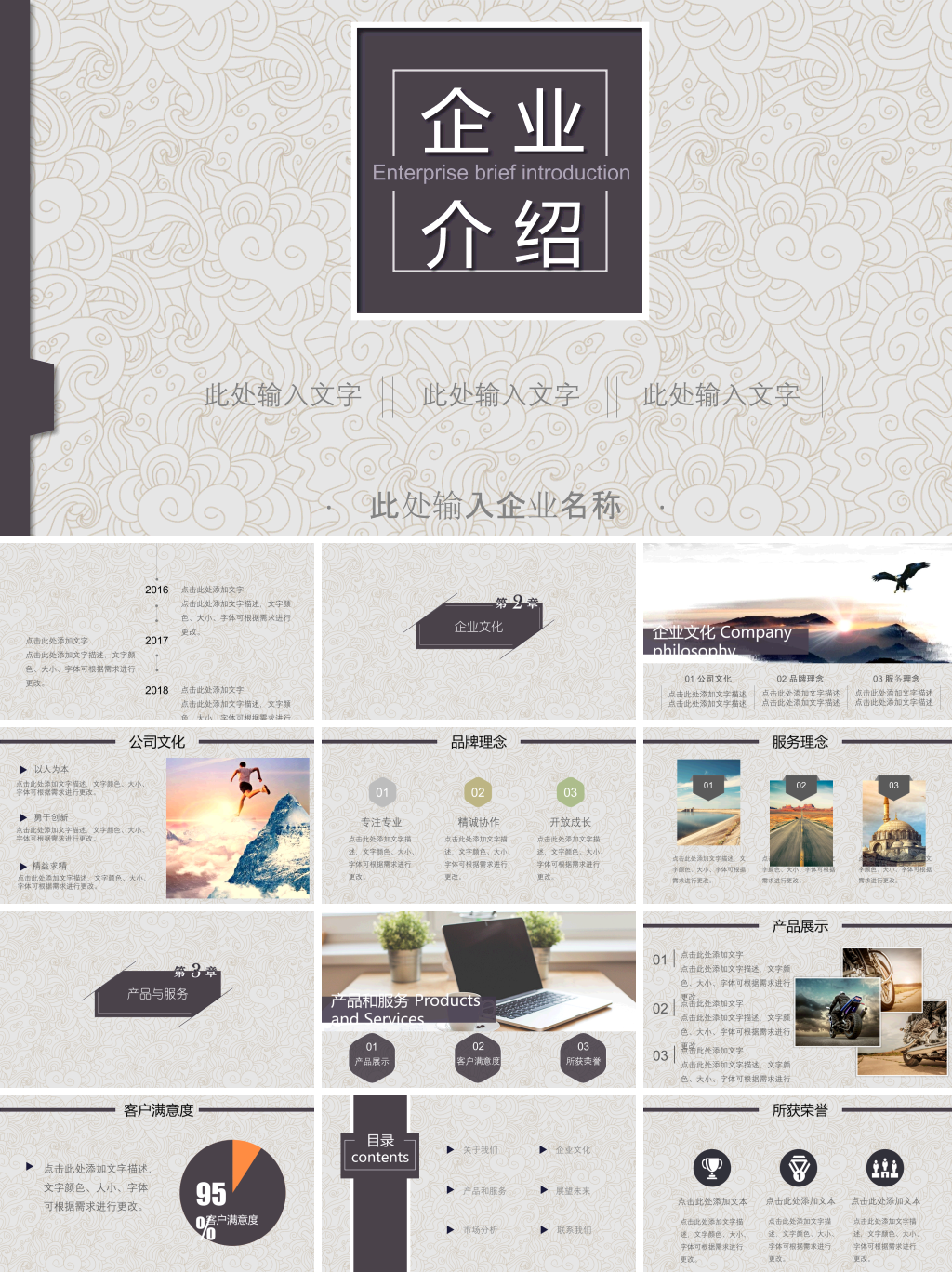 本套简约大气中国风企业介绍动态PPT模板,模板编号:P34519,大小10MB,共27页,比例为16:9,由封面、目录、转场页、内容、结尾5个部分构成。