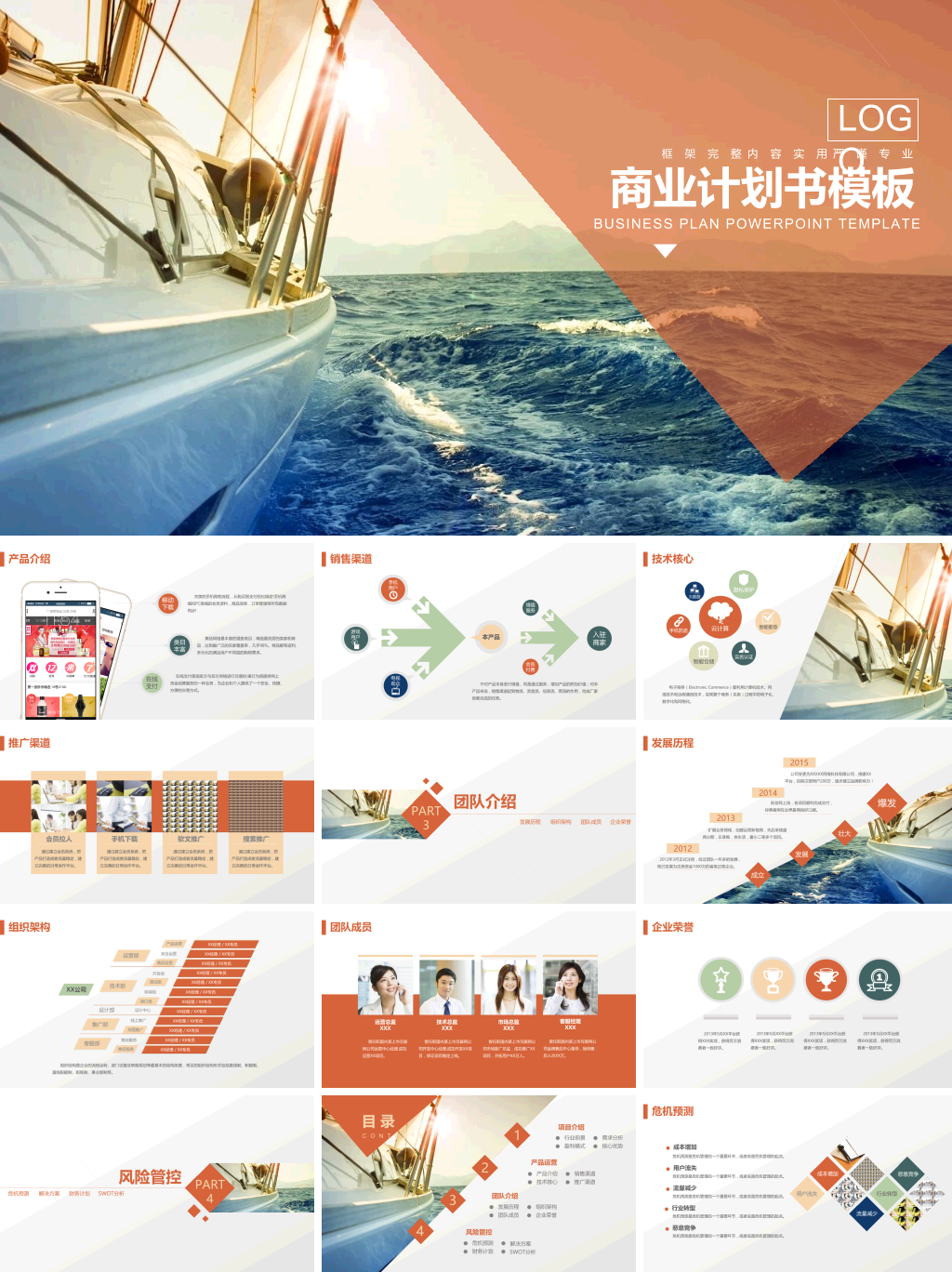 本套商业计划书PPT模板,模板编号:P85192,大小10MB,共27页,比例为16:9,由封面、目录、转场页、内容、结尾5个部分构成。