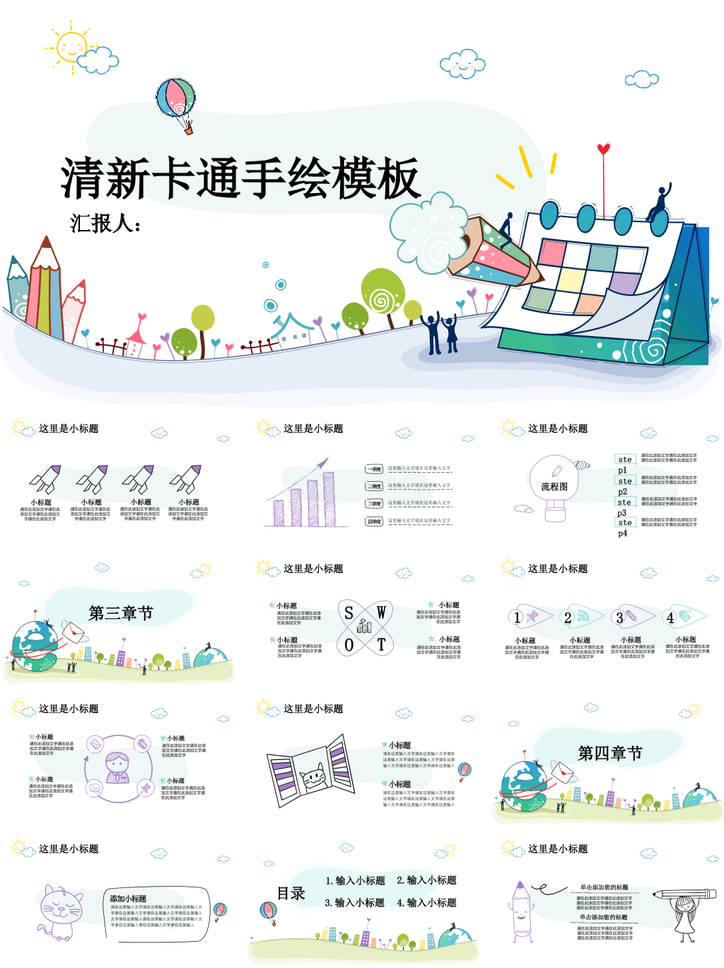 内含蓝色,绿色多种配色,精美小清新,卡通风风格设计,动态播放效果,精美实用。