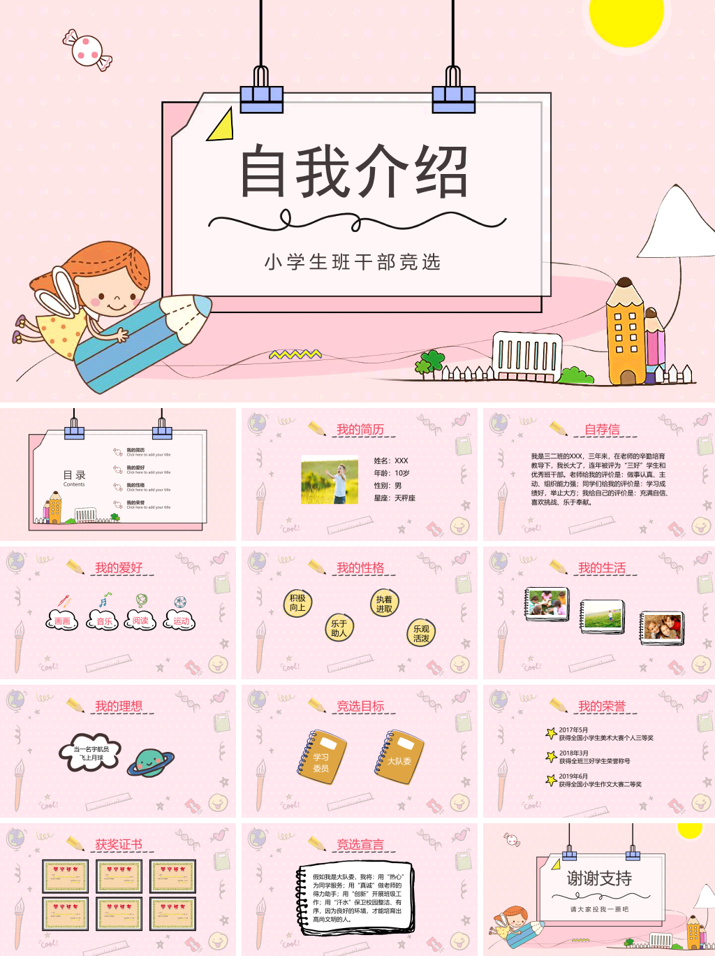 PPT模板名称:粉色卡通小学班干部竞选自我介绍PPT模板,模板编号:P69143,大小10MB,共27页,比例为16:9,由封面、目录、转场页、内容、结尾5个部分构成。