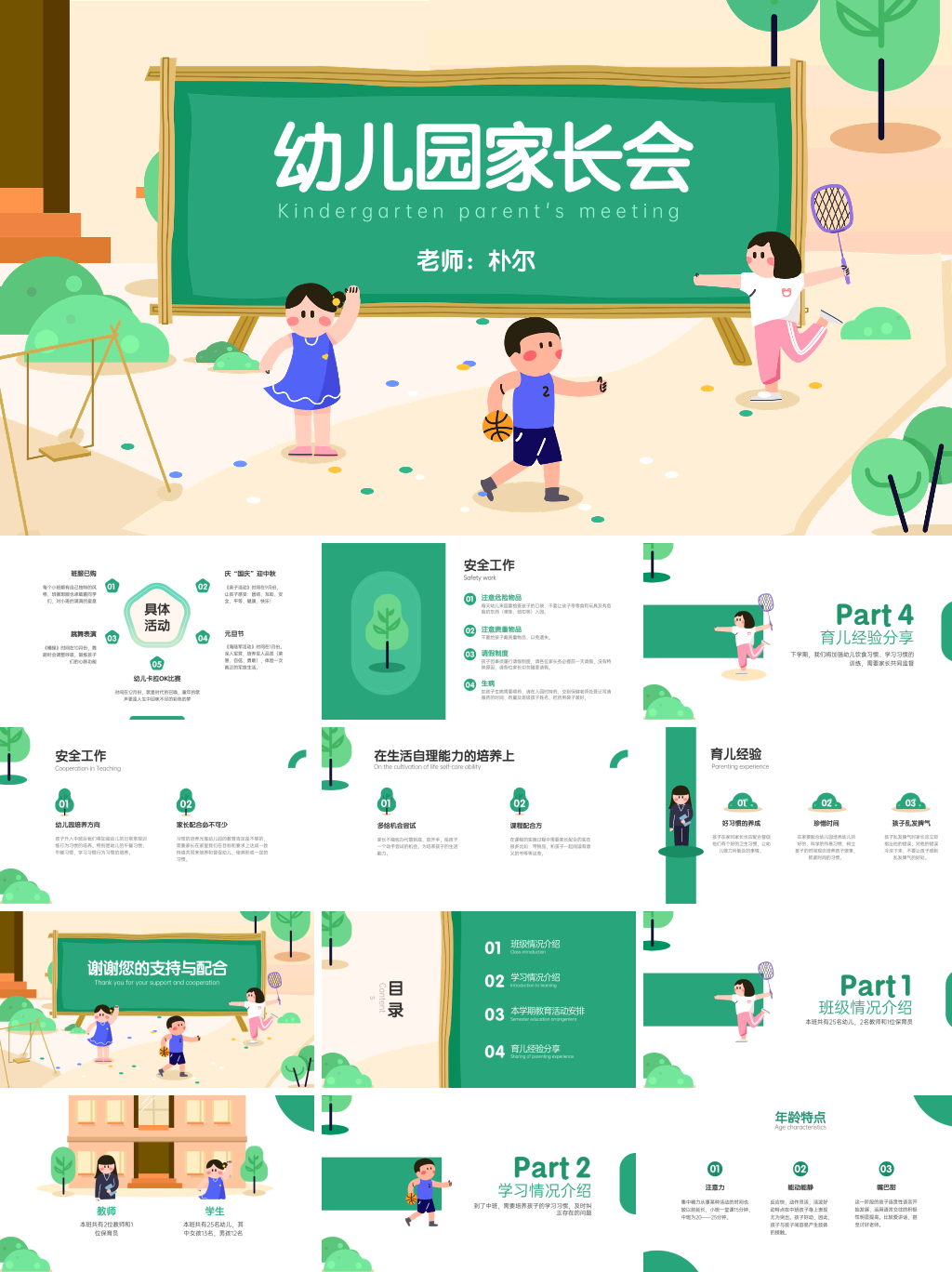 PPT模板名称:绿色手绘插画幼儿园家长会PPT模板,模板编号:P55687,大小10MB,共27页,比例为16:9,由封面、目录、转场页、内容、结尾5个部分构成。