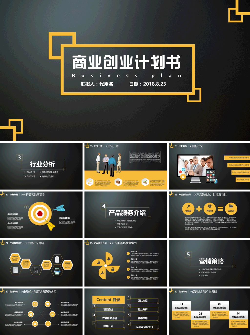 设计使用橙色,灰色多种配色,精美商务风风格设计,动态播放效果,精美实用。