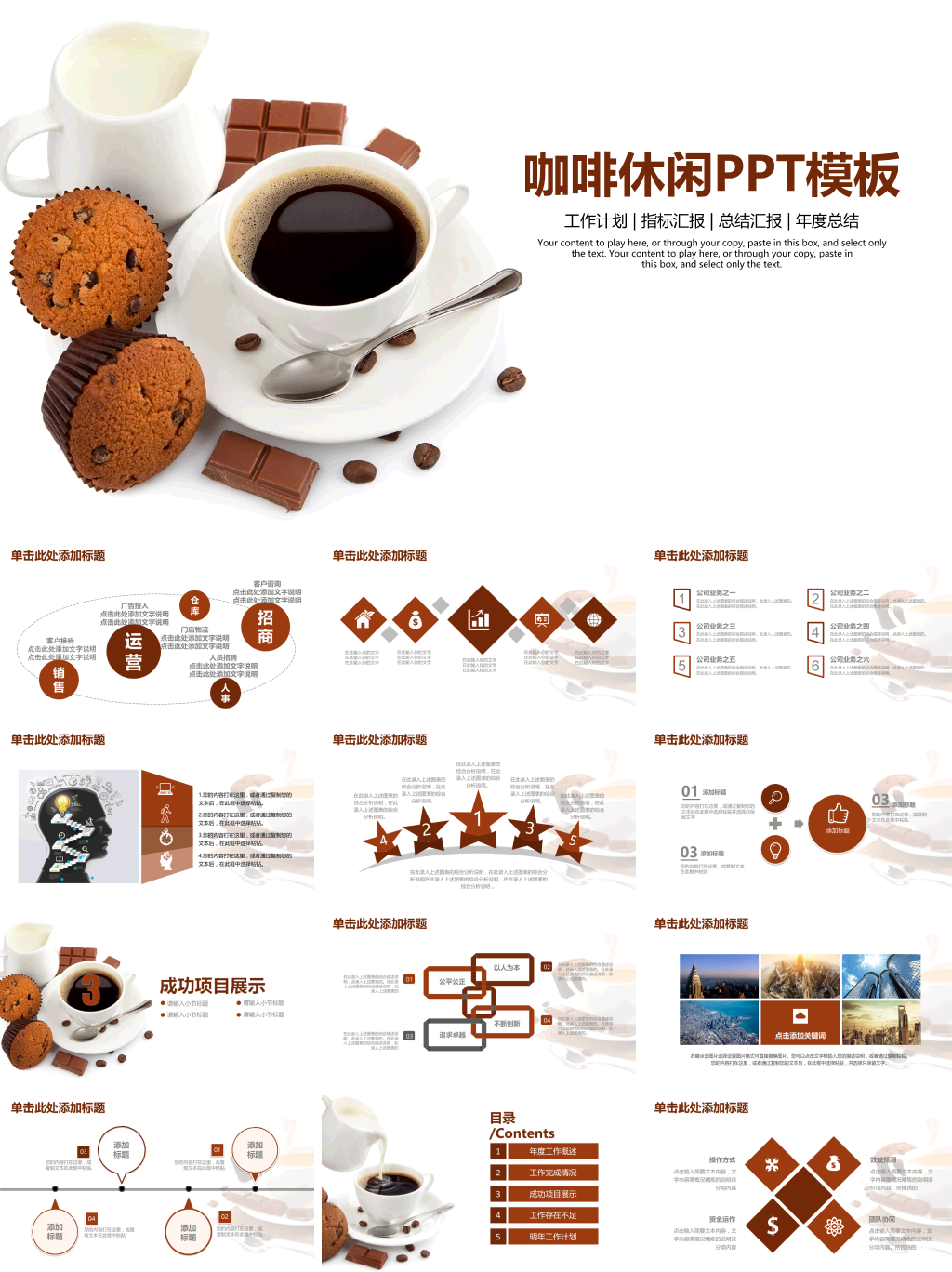 PPT模板名称:咖啡休闲PPT模板,模板编号:P57447,大小10MB,共27页,比例为16:9,由封面、目录、转场页、内容、结尾5个部分构成。