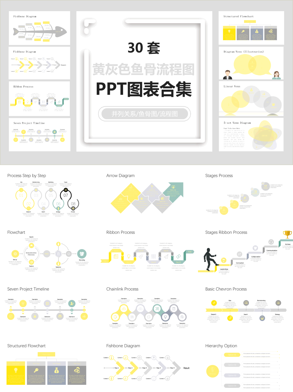 下载地址: 黄灰色鱼骨流程图图表合集PPT模板-优页文档