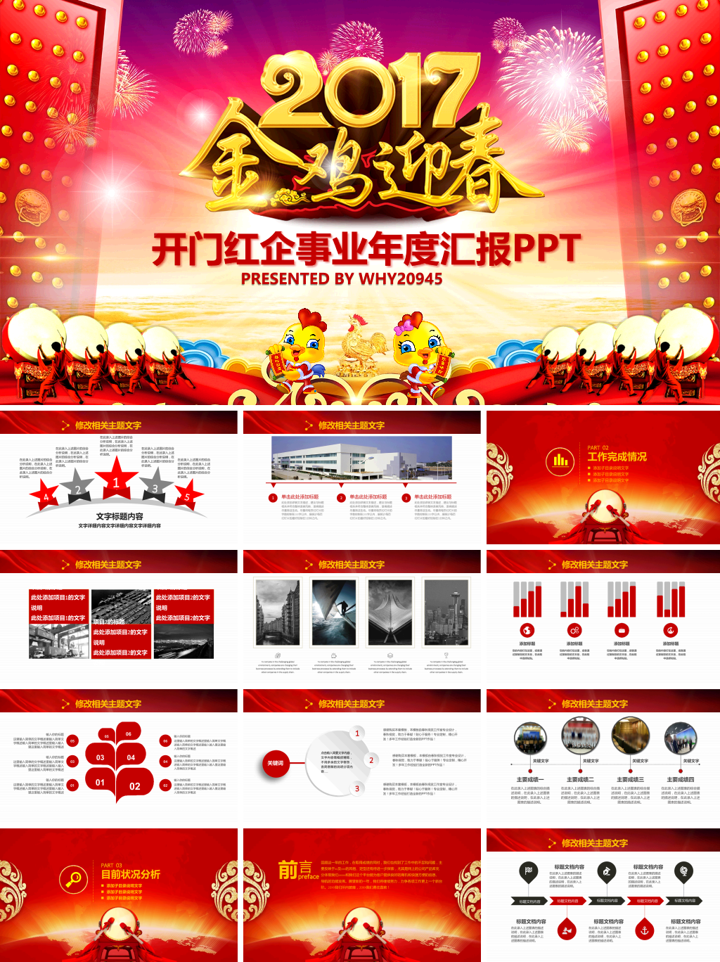 PPT模板名称:开门红企事业年度汇报PPT模板,模板编号:P16818,大小10MB,共27页,比例为16:9,由封面、目录、转场页、内容、结尾5个部分构成。