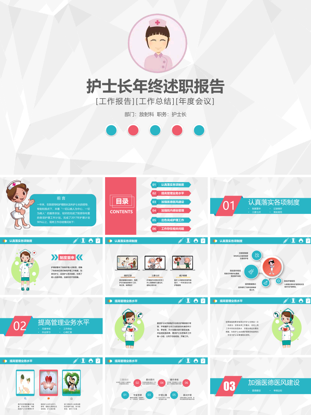 PPT模板名称:护士长述职报告PPT模板,模板编号:P56138,大小10MB,共27页,比例为16:9,由封面、目录、转场页、内容、结尾5个部分构成。