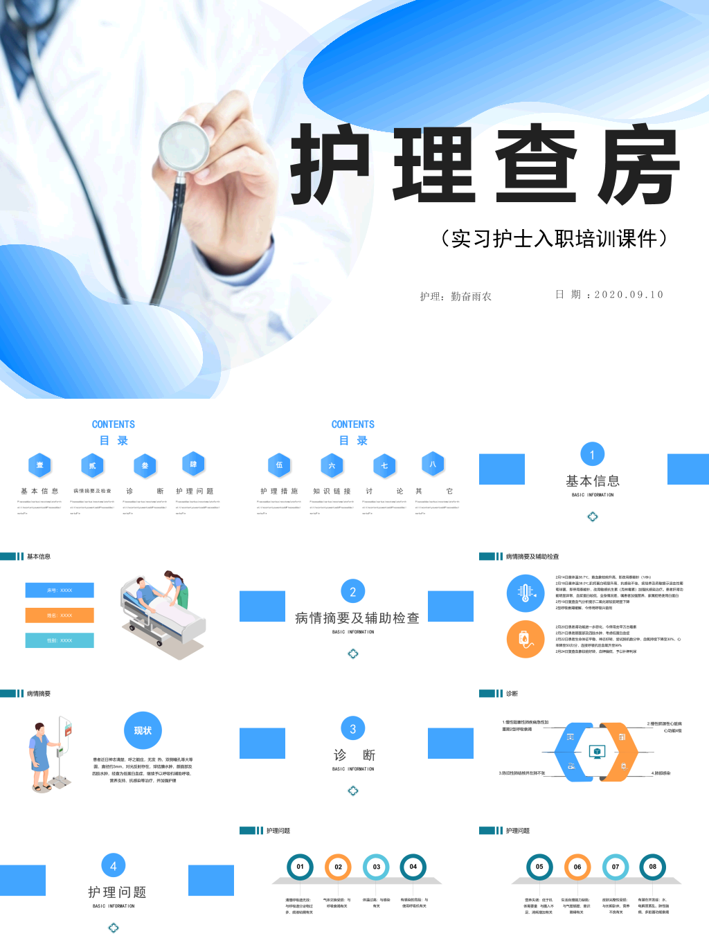 PPT模板名称:护理查房PPT模板,模板编号:P31785,大小10MB,共27页,比例为16:9,由封面、目录、转场页、内容、结尾5个部分构成。