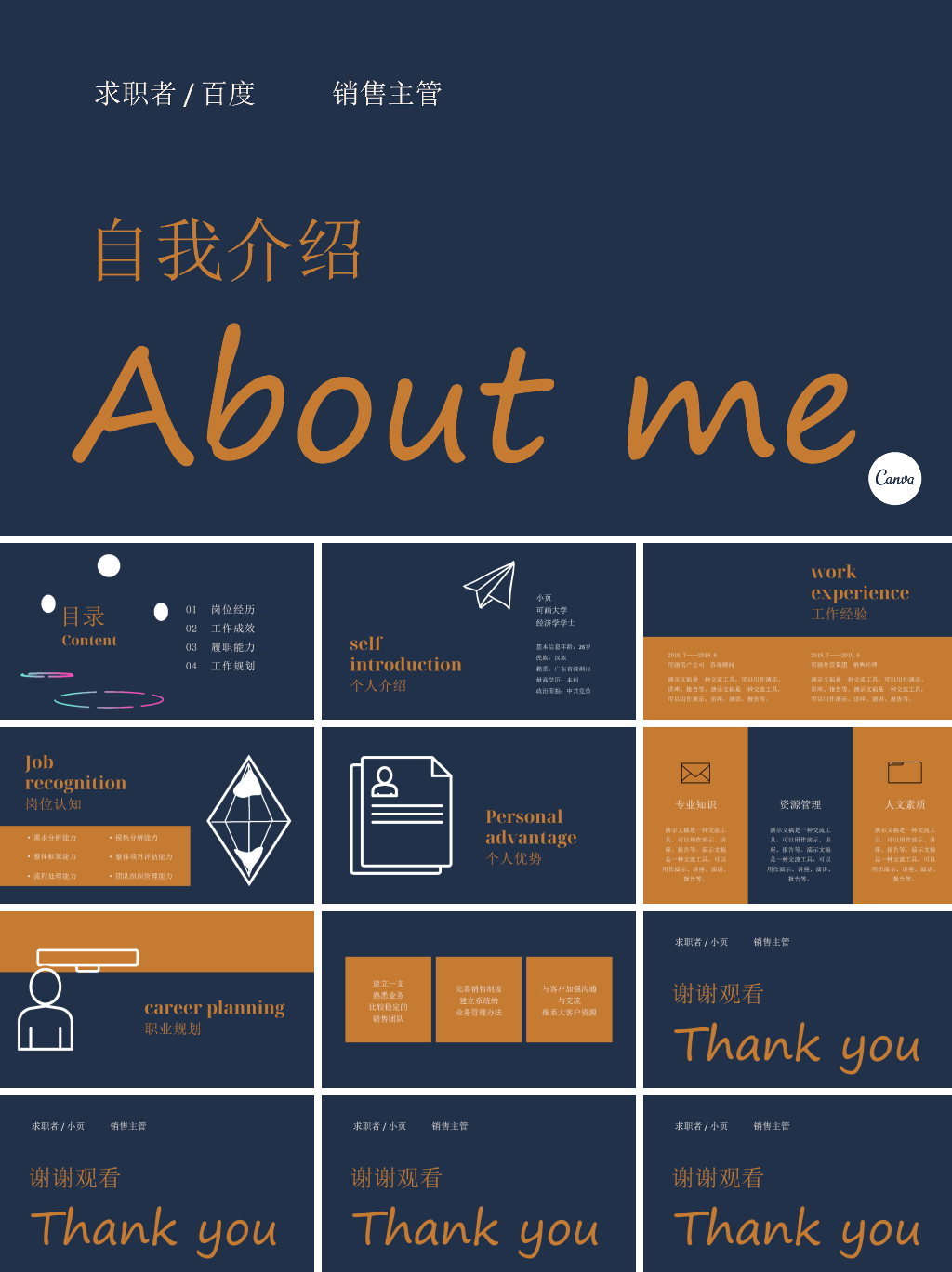 PPT模板名称:求职自我介绍PPT模板,模板编号:P51192,大小10MB,共27页,比例为16:9,由封面、目录、转场页、内容、结尾5个部分构成。