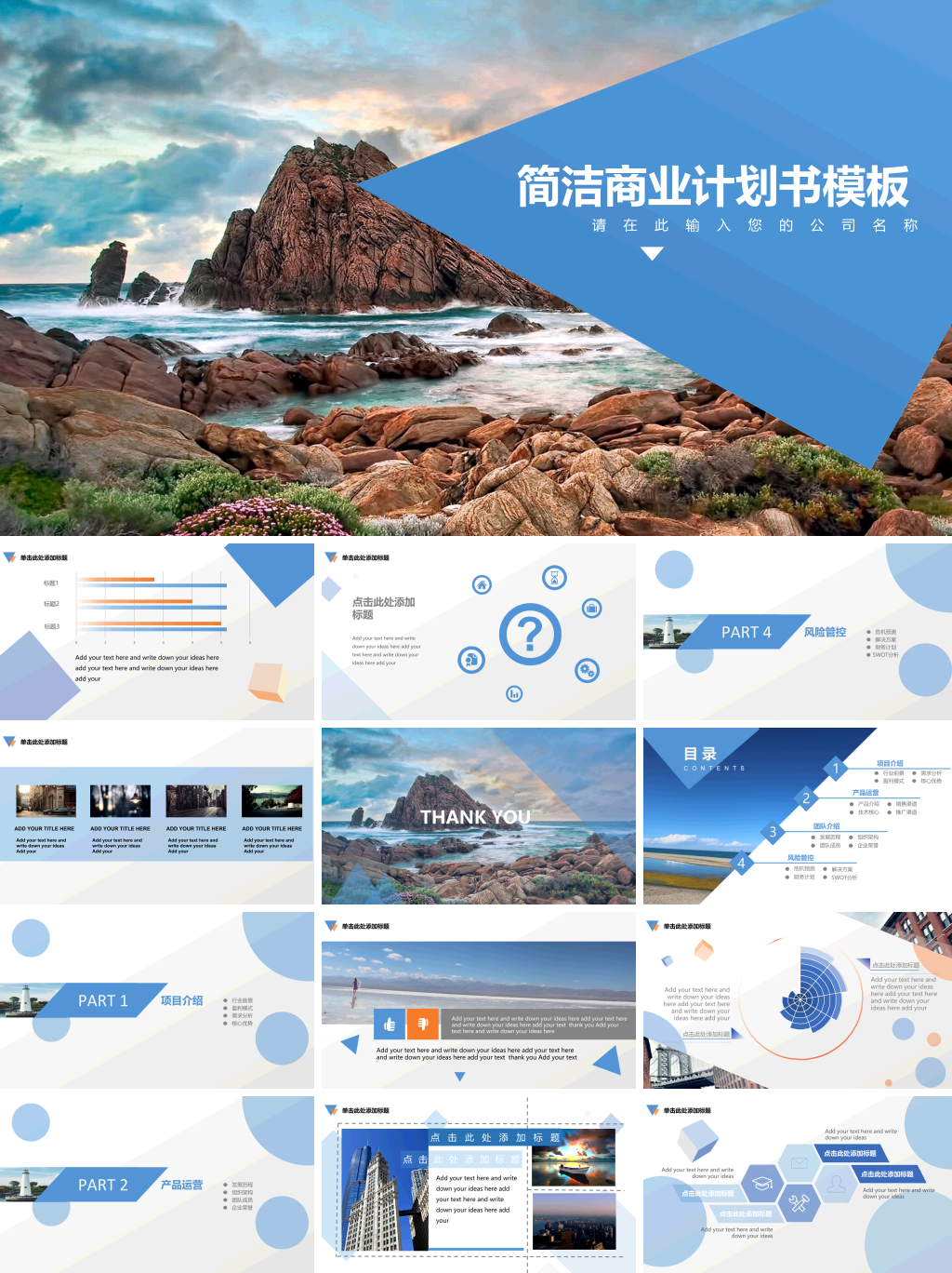 PPT模板名称:简洁商业计划书PPT模板,模板编号:P36149,大小10MB,共27页,比例为16:9,由封面、目录、转场页、内容、结尾5个部分构成。