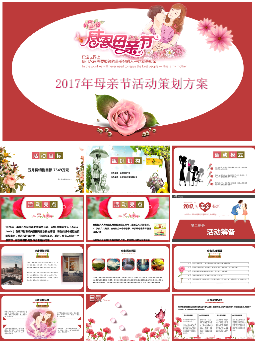 PPT模板名称:母亲节活动策划方案PPT模板,模板编号:P23396,大小10MB,共27页,比例为16:9,由封面、目录、转场页、内容、结尾5个部分构成。