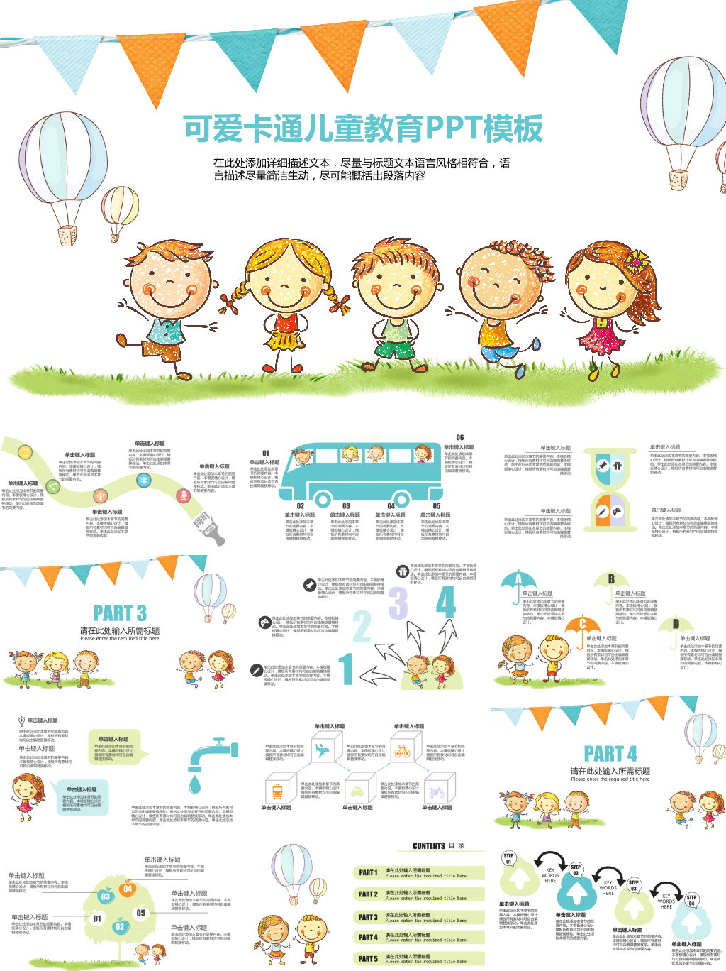 PPT模板名称:可爱卡通儿童教育课件PPT模板,PPT编号:P93975,文件大小10MB,共27页页,比例为16:9。