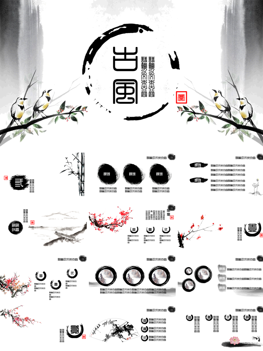 PPT模板名称:水墨古风动态PPT模板,PPT编号:P52534,文件大小10MB,共27页页,比例为16:9。