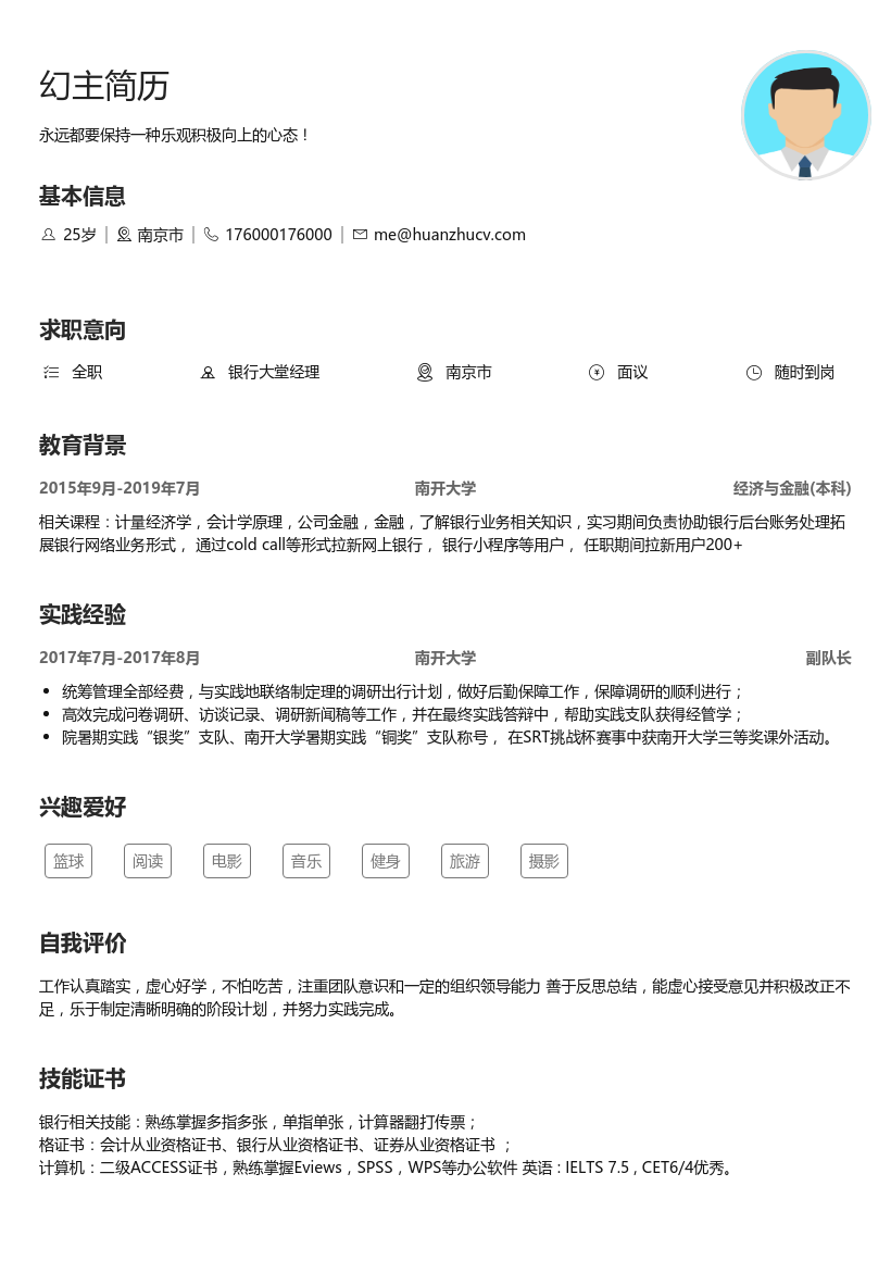 这是一份专业的银行大堂经理简历模板,来自南开大学经济与金融本科毕业生,拥有相关实习经验,寻求在南京市的全职职位。求职者具备良好的团队协作和组织能力,对银行业务有深入了解。