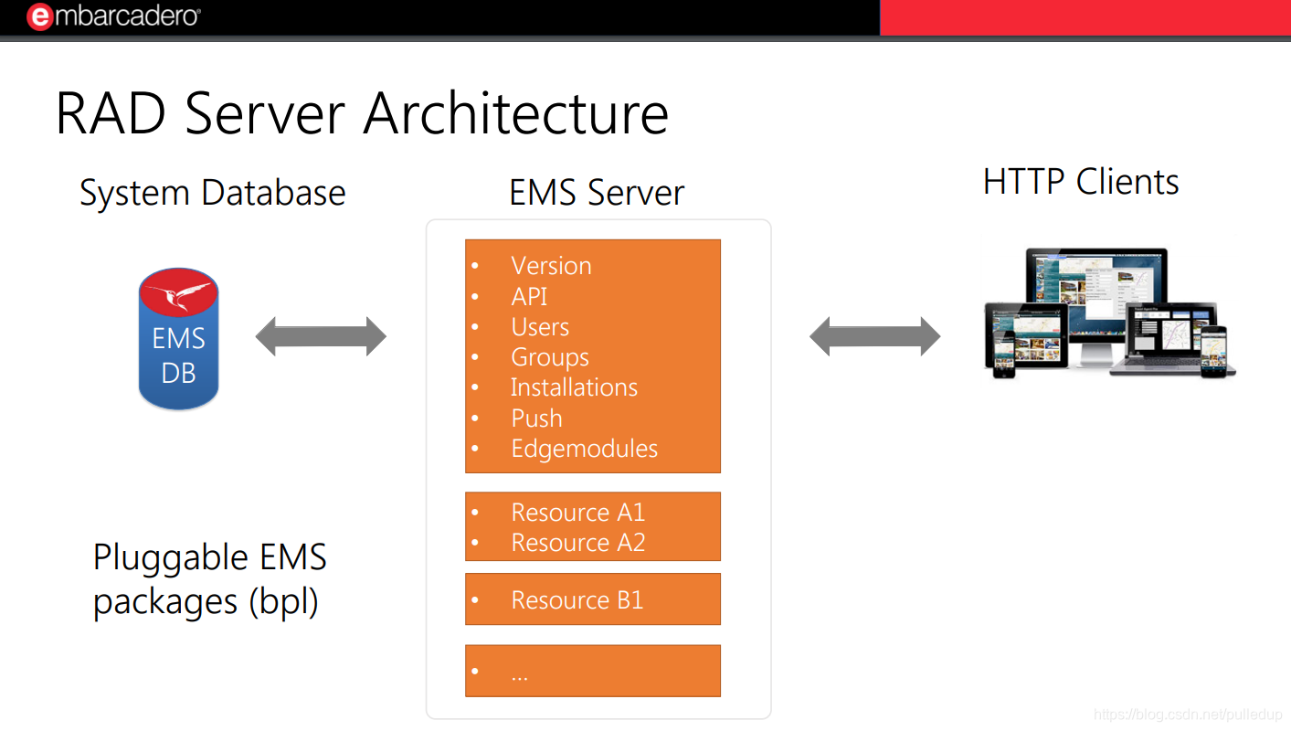 从delphiXE 10.2起,全面采用EMS Server和EMS Console Server为RAD Server架构提供中间件支持,架构如下: