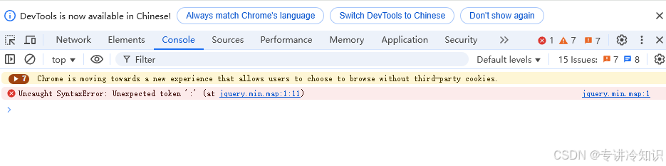 遇到 Uncaught SyntaxError: Unexpected token ':' 这类错误,通常意味着你的 JavaScript 代码中存在语法错误。这种错误经常是由于某些地方的代码书写不正确导致的。在你的情况中,错误出现在 jquery.min.map:1:11,这通常指向一个源代码映射文件(source map,用于方便开发调试),而不是实际的 JavaScript 代码。