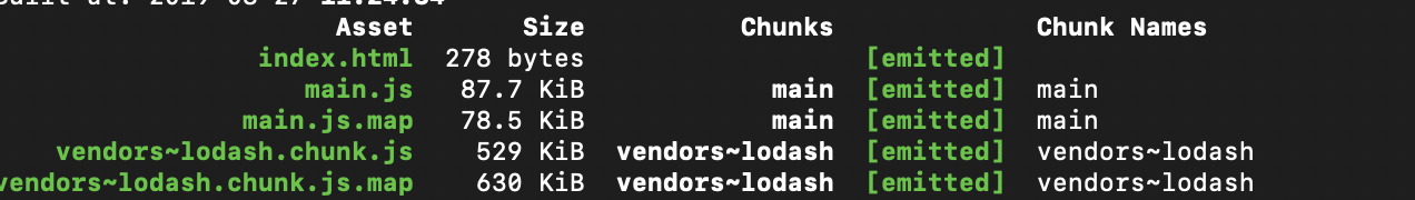 然后,运行打包命令。发现现在我们的文件名是这样的。js 文件分别是main.js 与 vendors~lodash.chunk.js。