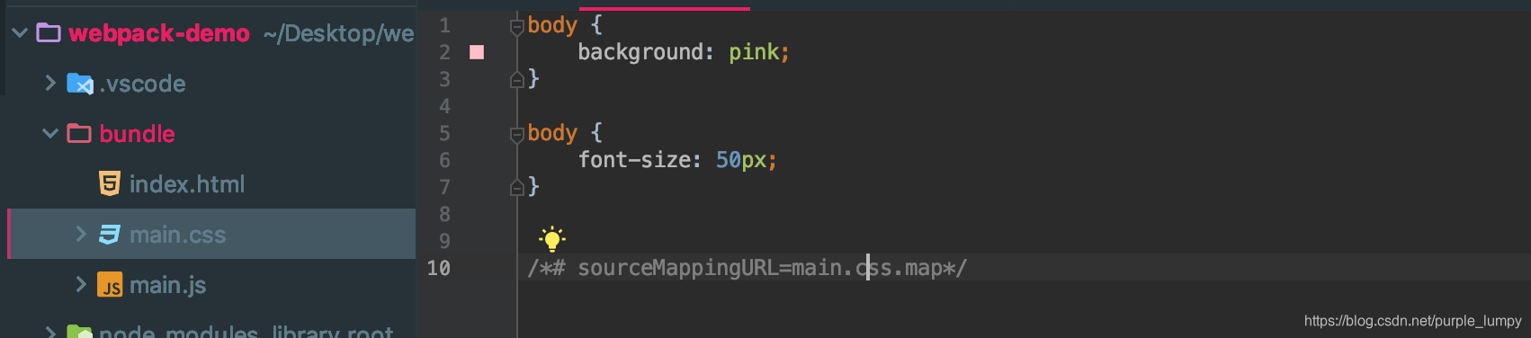 我们来看看打包生成的文件,只有html 与 js 文件。而html 中是没有刚刚的样式的。也就是说,webpack 在打包的时候会把我们的css 文件代码打包进 js 文件中。(CSS in JS)