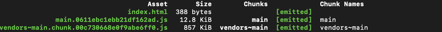 然后,打包生成的文件就如下。(vendors 中保存的是node_module中的代码,参考前面splitChunks 文章,splitChunks 默认配置项cacheGroups )