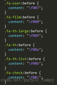 下面是css文件中.css 中内容,如下,css 中会给某些代表图标的类,使用before(也许有after)伪类,设置一种特殊字体“\xxxx”,这种字体便是fonts中已经编码好了的。
