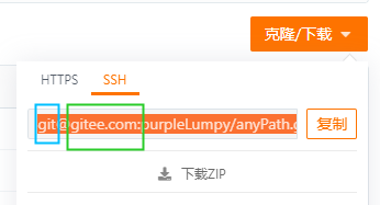 我们可以去远程仓库看一看,比如下面。仓库克隆地址里面,@前面的内容(篮筐)就是配置里 User 的值,@与:之间的内容(绿框)就是配置里 HostName 的值。而配置里IdentityFile 就是密钥的存放文件。