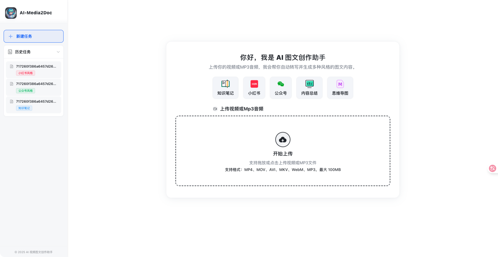 AI 视频图文创作助手是一款Web工具, 基于AI大模型, 将视频和音频转化为各种风格的文档, 无需登录注册, 前后端本地部署,以极低的成本体验 AI 视频/音频转风格文档服务。一键将视频和音频转化为小红书/公众号/知识笔记/思维导图/视频字幕等各种风格的文档。