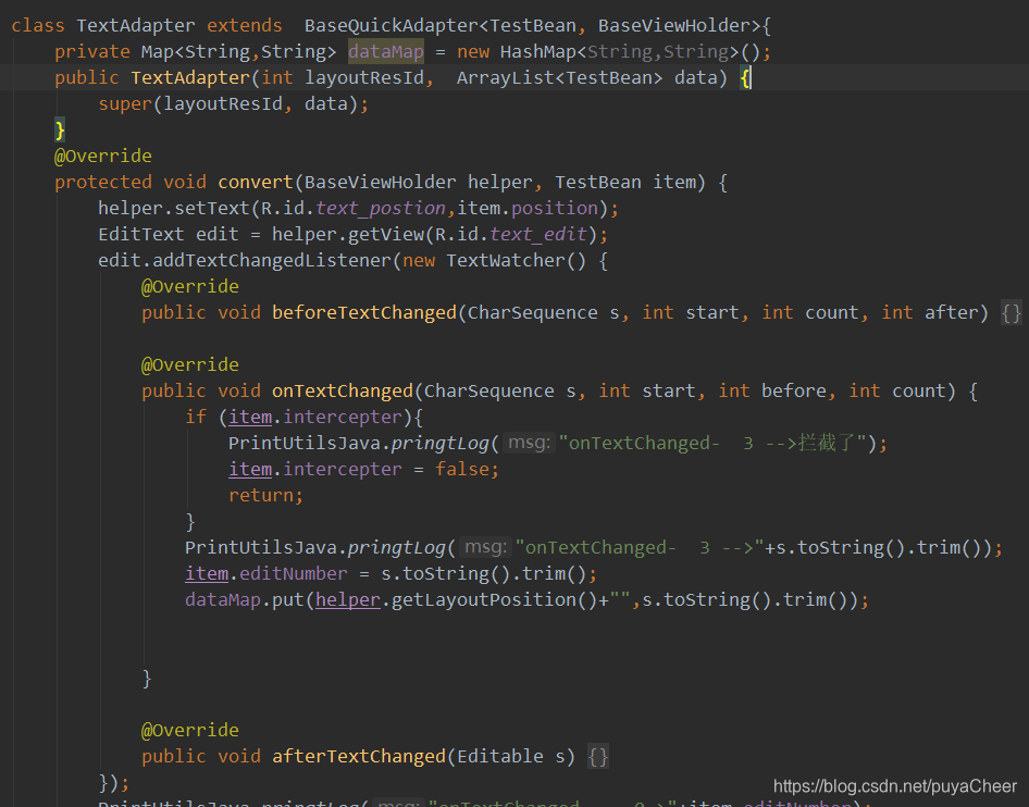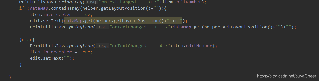 PrintUtilsJava.pringtLog("onTextChanged- 1 -->"+dataMap.get(helper.getLayoutPosition()+"")+"");