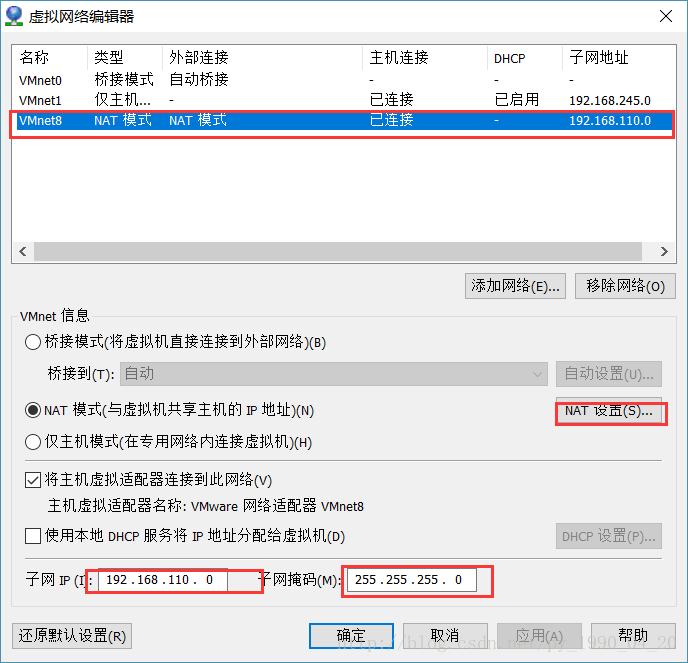 可以在菜单栏的编辑--->虚拟网络编辑器设置NAT虚拟网络