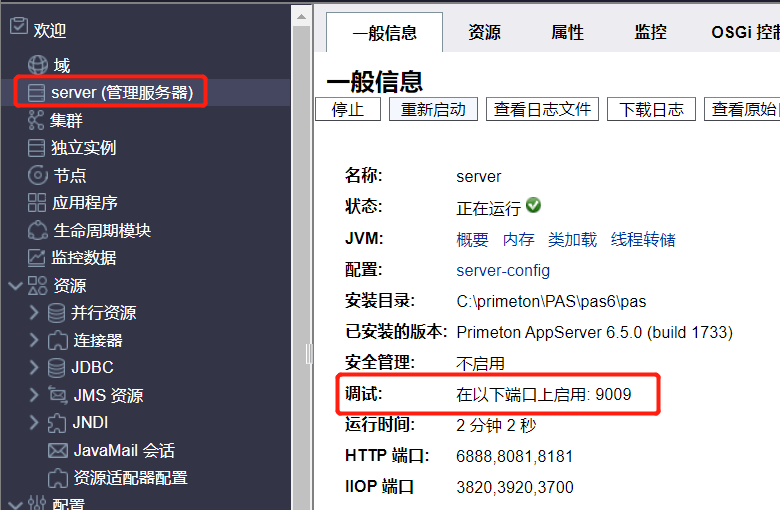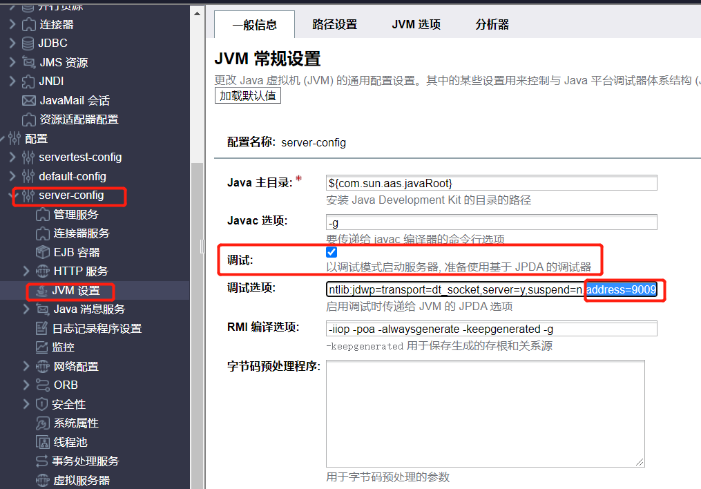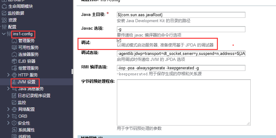 在server-config下的“jvm配置”页面中勾选调试,可以通过“调试选项”中address的值指定调试端口,保存,然后重启实例,即可在实例信息里看到调试端口号。例如下图: