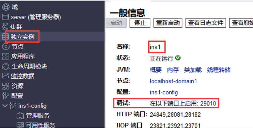 若自行创建的实例可参考如下配置,例如:实例ins1,在ins1-config的JVM配置页面点击调试,在实例信息里看到调试端口号
