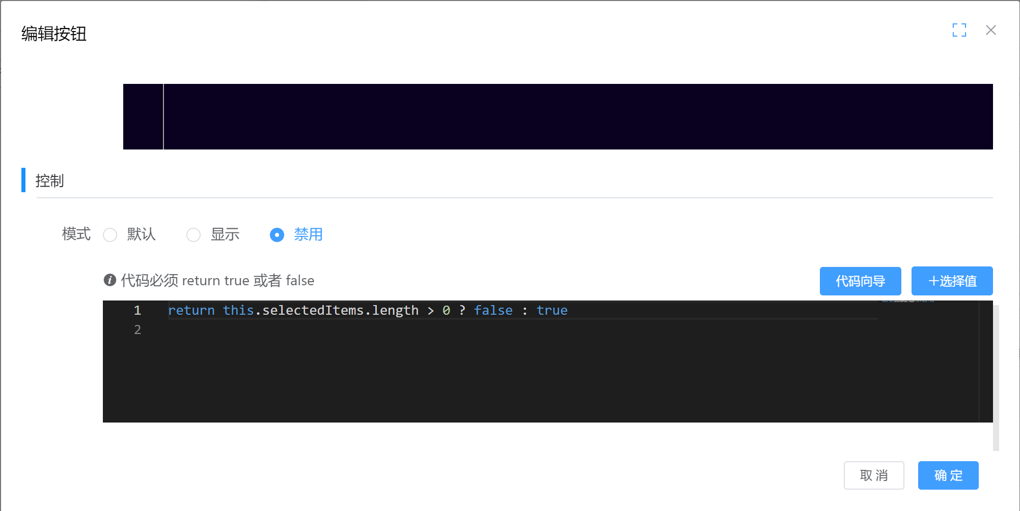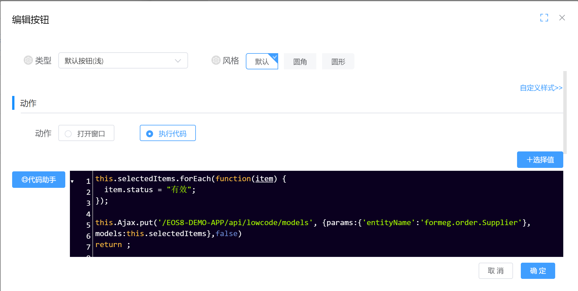 给按钮添加动作和控制,使用forEach方法遍历修改字段值,并通过this.Ajax.put方法请求/api/lowcode/models接口,更新字段值到后端。