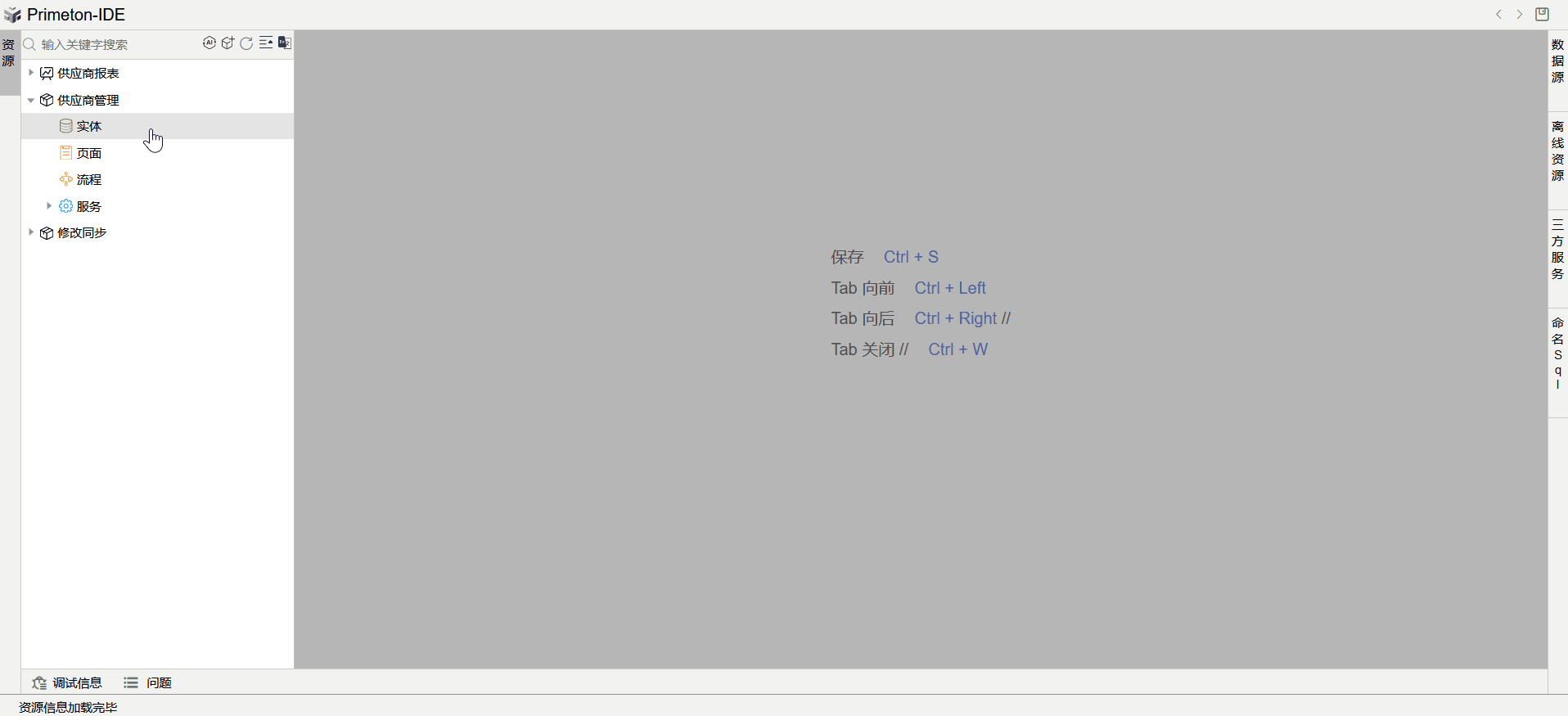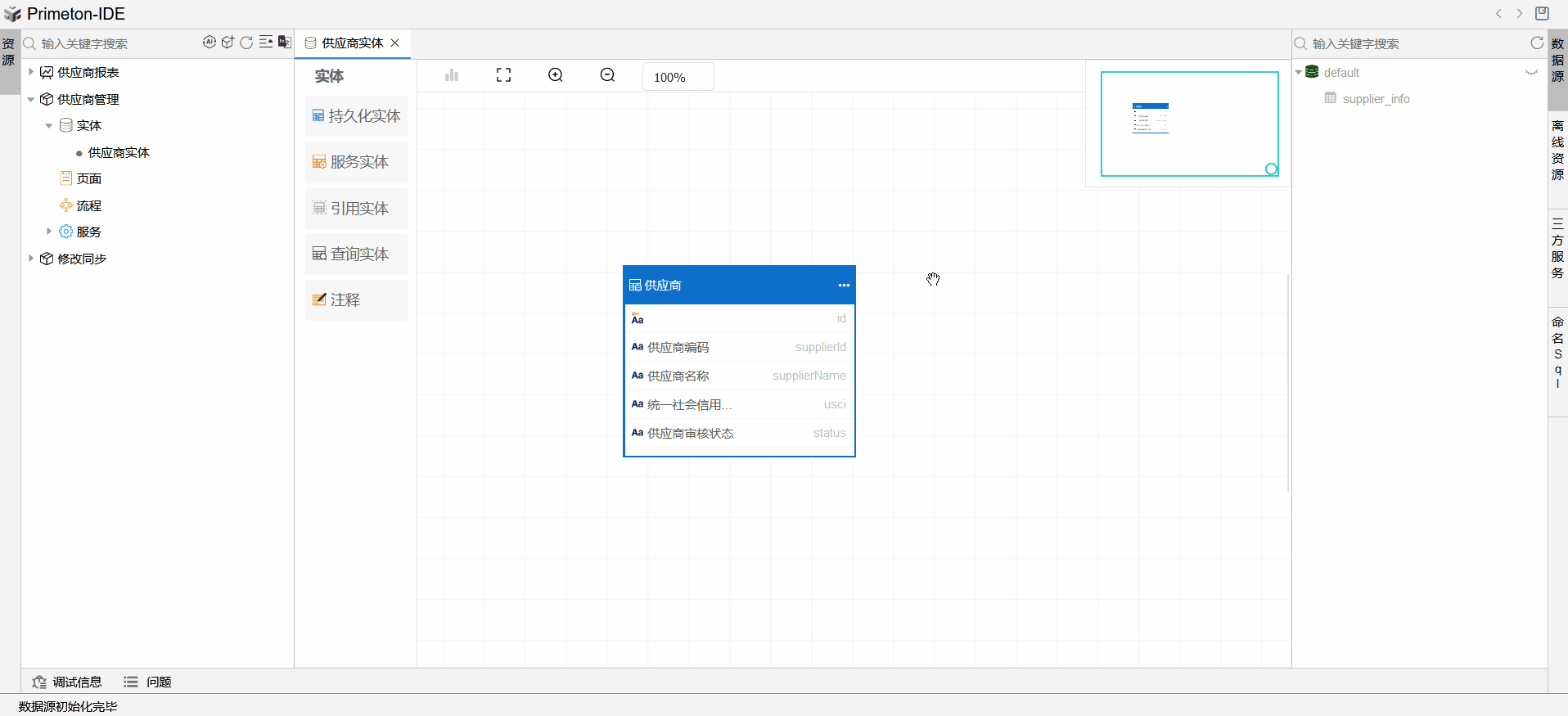 创建供应商数据实体,从右侧数据源内拖拽供应商数据表至模型实体页面。