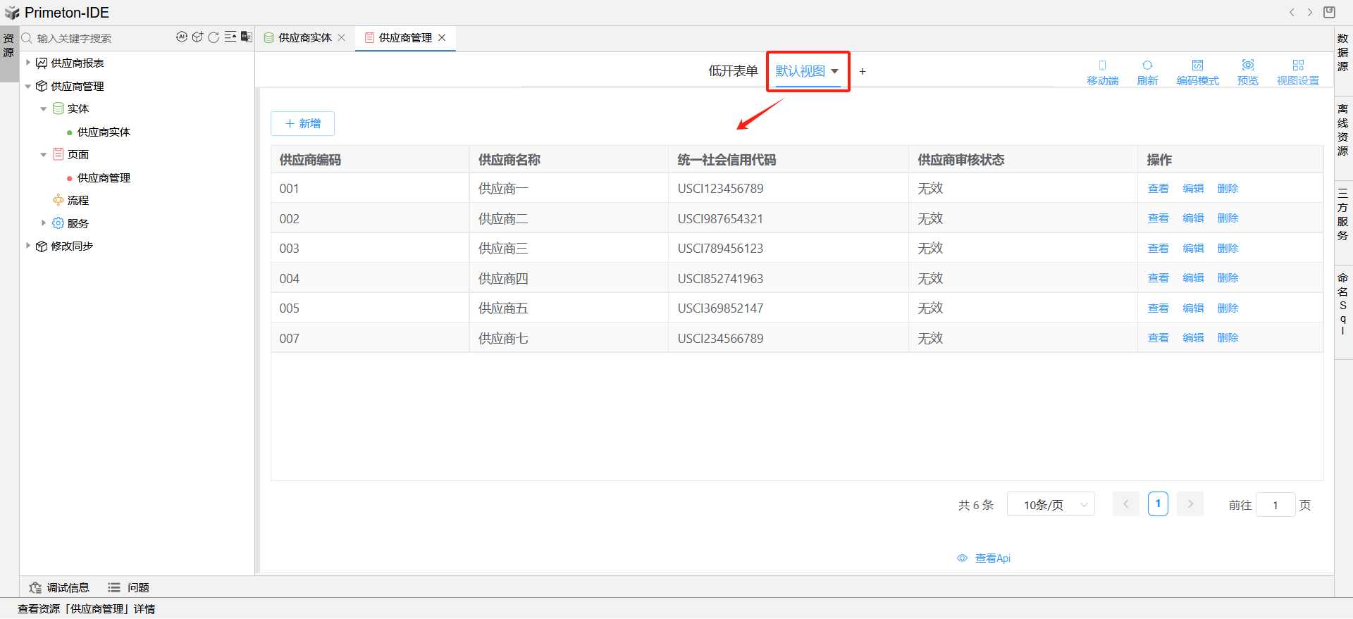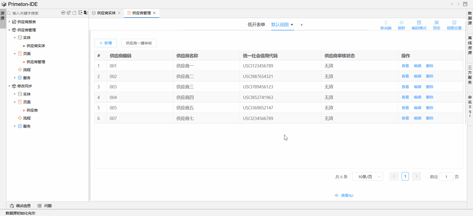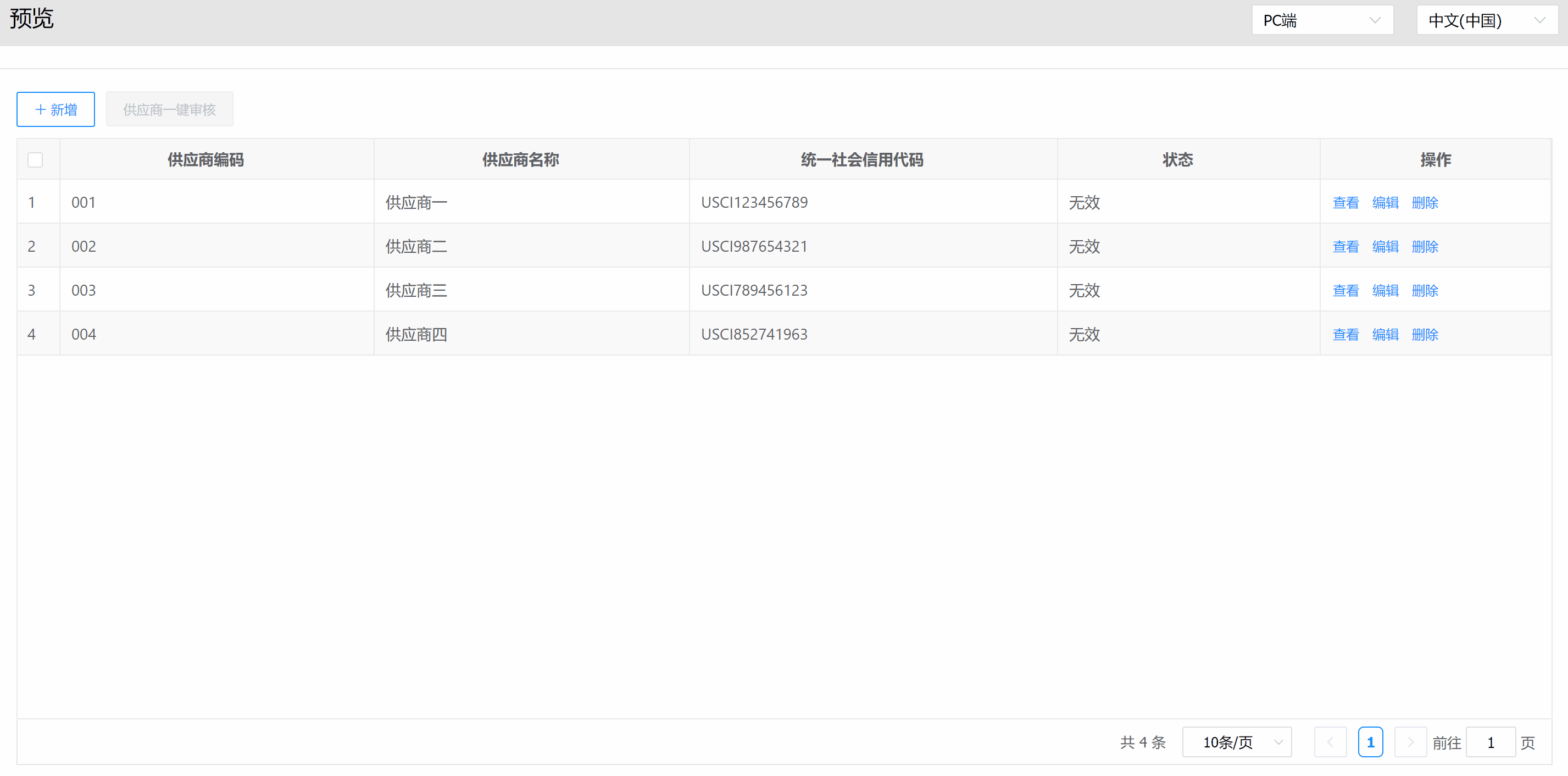 供应商管理中,在表单中新增供应商时,供应商审核状态默认为无效,然后在视图中添加供应商一键审核按钮,可以把视图中已勾选的的供应商审核状态改为有效。
