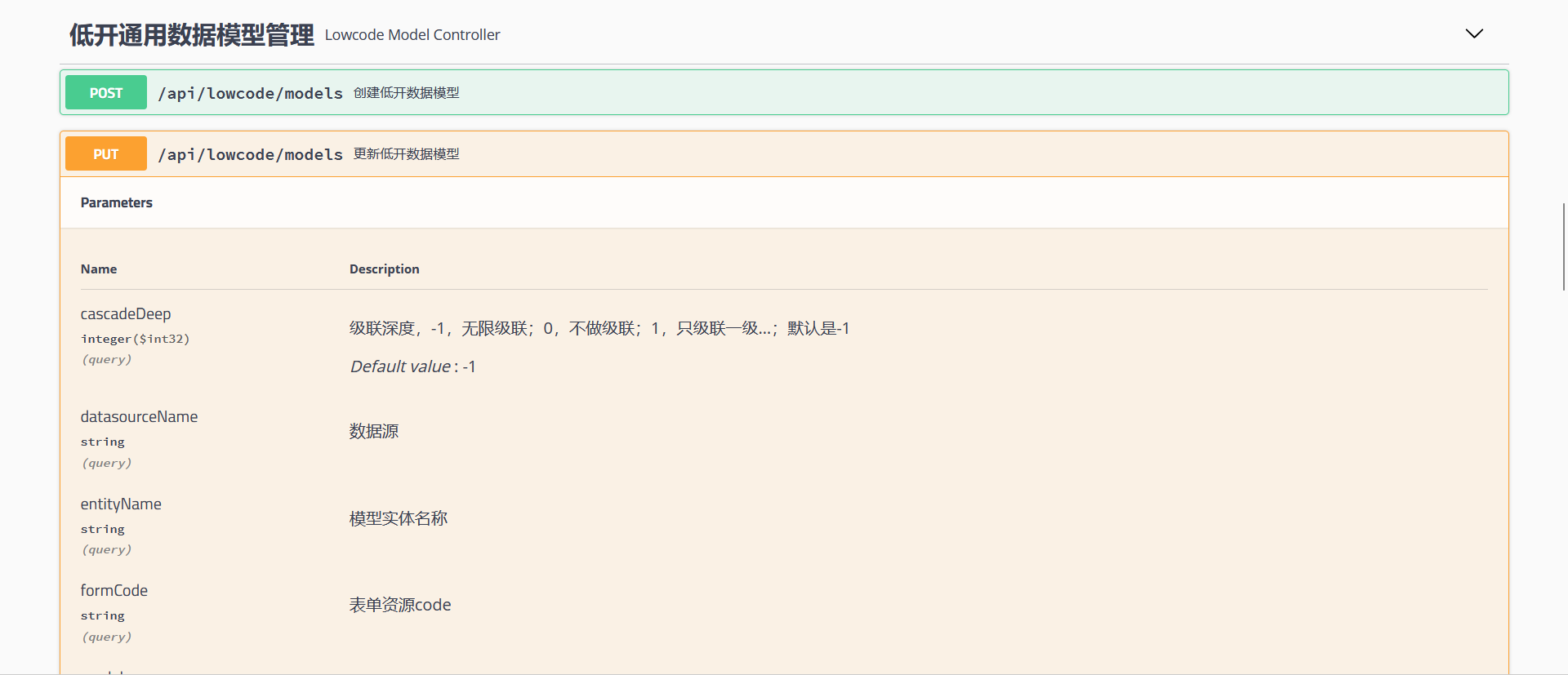 接口文档地址:http://localhost:AFCenter后端端口/swagger-ui.html?urls.primaryName=lowcode#/低开通用数据模型管理/updateUsingPUT_74