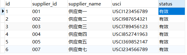 INSERT INTO `supplier_info` VALUES ('1', '001', '供应商一', 'USCI123456789', '无效');