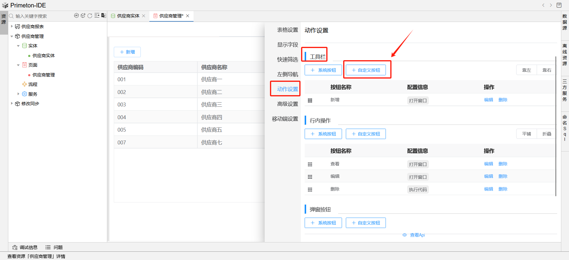 在视图页面中,右上角-视图设置-动作设置-工具栏,点击自定义按钮。