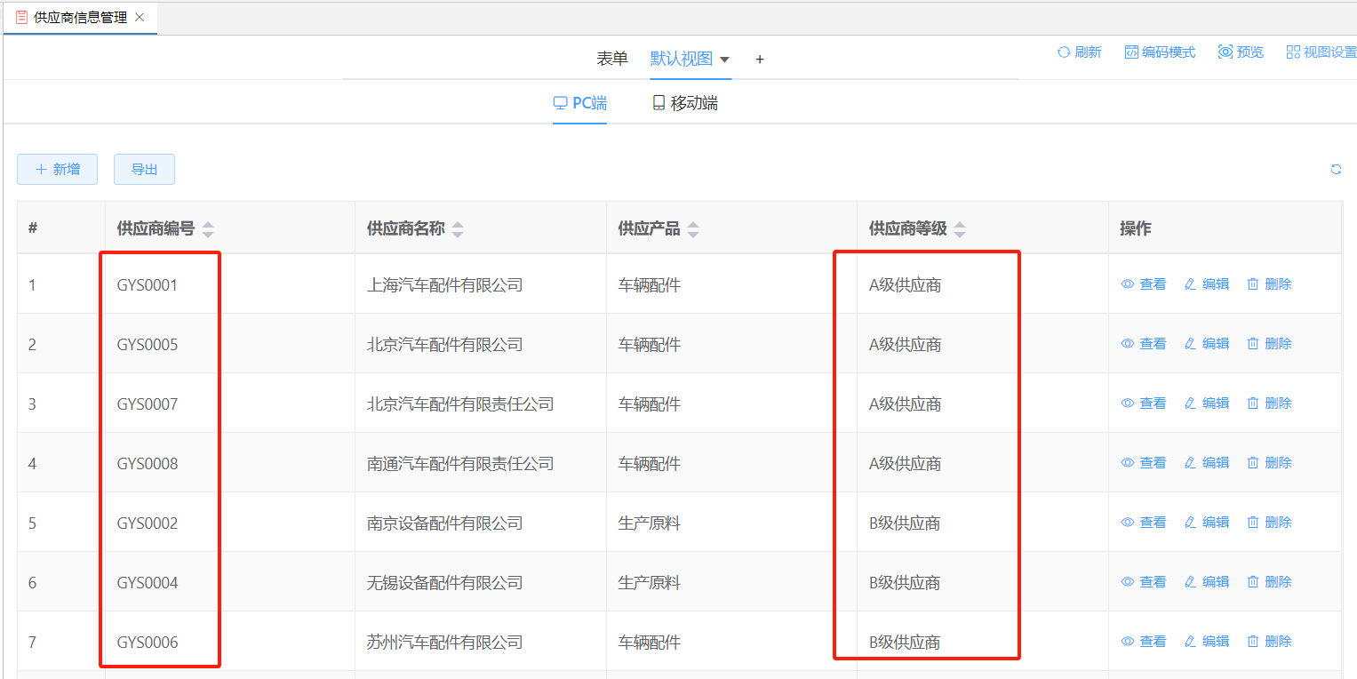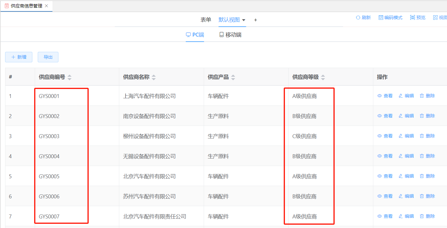 1.场景介绍 "供应商信息管理"存在多个字段,本文以先按照"供应商等级"升序排序,再按照"供应商编号"升序排序为例,讲解视图中表格根据多字段排序的实现。 #2.效果展示 表格默认没有排序,排序前效果: 先按照"供应商等级"升序排序,再按照"供应商编号"升序排序后效果: #3.实现思路 进入需要排序的表单视图,添加“视图加载前”事件,调用this.sortInfo。