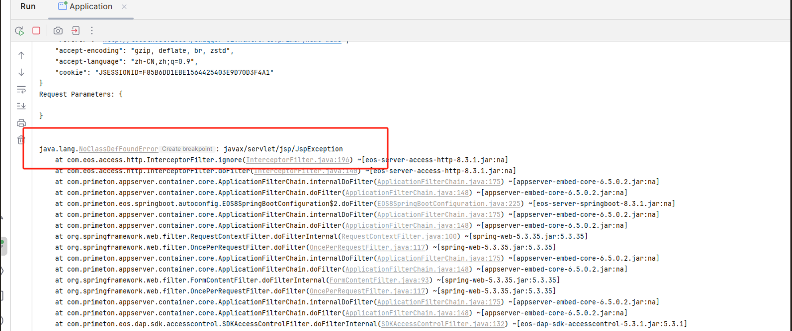 使用idea插件,ide中创建微服务项目,导入idea中运行,打开swagger-ui后报错:java.lang.NoclassDefFoundError Create breakpoint : javax/servlet/jsp/JspException