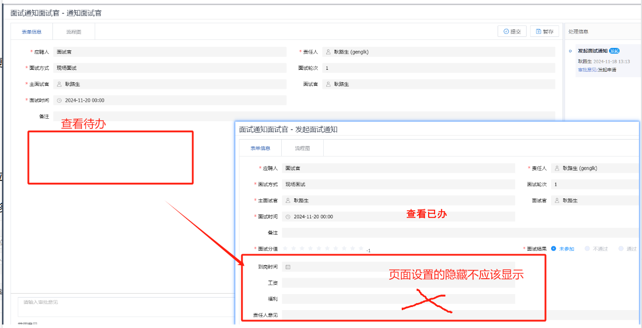 在“流程中心—我的任务—已办”中查看流程时,展示的表单状态是固定的“查看”状态;如果用户设置了自定义的表单状态,这时会出现页面期望展示的字段和已办中的字段显隐不一致。