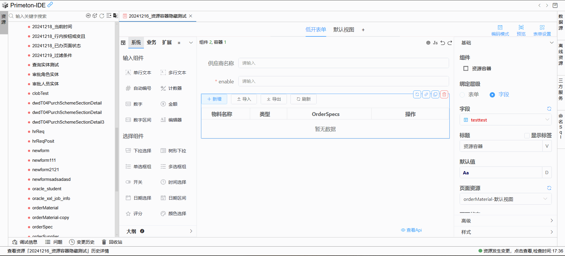 表单内根据表单状态 this.status 并使用 this.Api.hideElements('') 控制组件(资源容器和按钮)显隐时,但是通过视图的行内按钮打开时未生效。