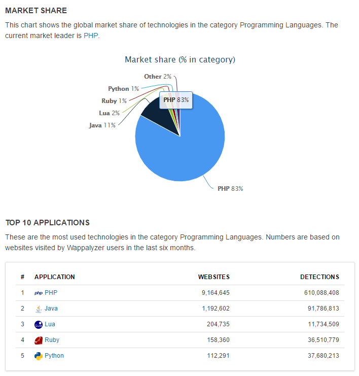 虽然近一段时间PHP看起来有点过气了。但是请不要忘记,PHP是全世界最好的语言。而且单就Web开发这一块来讲,全世界的网站有多一半是用PHP开发的。PHP7的推出极大地改善了其运行效率,Laravel框架也让编写PHP代码变得无比优雅。PHP不是原作者的菜,但译者最早学习的编程语言就是PHP,在这里也不想挑起语言之争,总之PHP值得你尝试着学习一下。