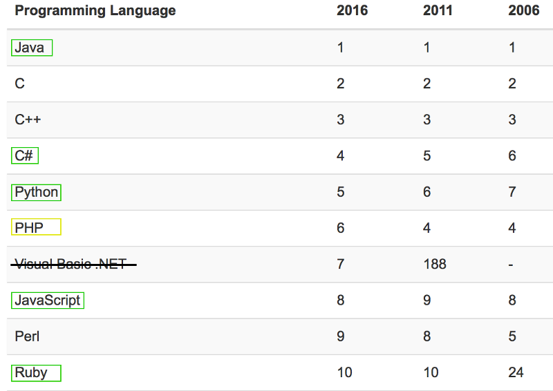 很不错的选择!首先你需要选择后端开发语言。可供选择的特别多,各有优劣。下图是一个编程语言受欢迎程度的排行榜。被框选起来的是Web开发中经常会用到的语言。