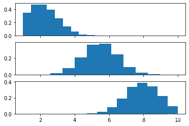 ax [ 2] 。hist ( X3 . rvs ( 10000 ), 密度= True )