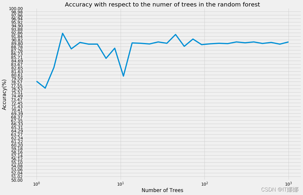 ax0 . set_title (“关于随机森林中树木数量的准确性” )